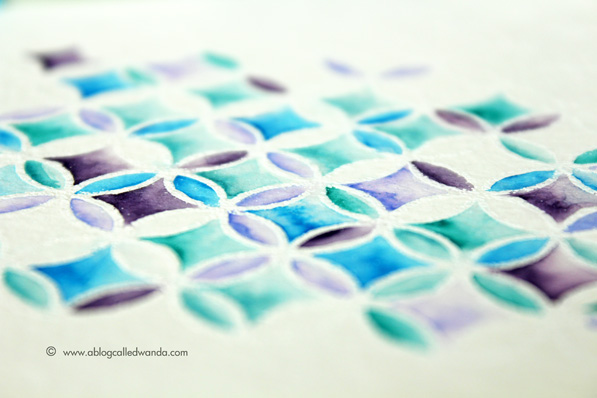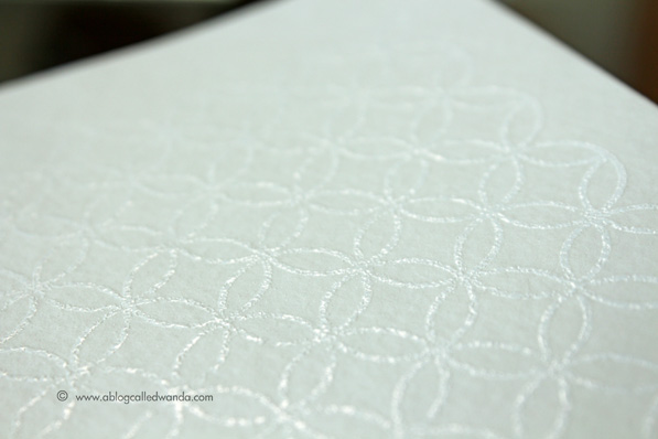 The first step is to take watercolor paper and white heat emboss your stamped pattern. This is a giant background stamp from Penny Black. I used Versamark Ink and White Embossing Powder.
