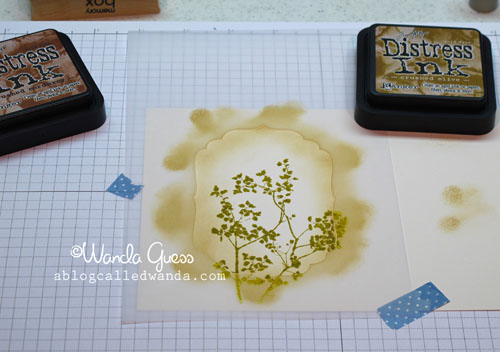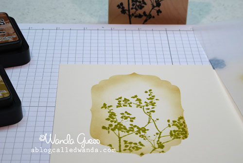 The technique is reverse masking. I cut a shape out of the center of a piece of vellum with one of my Nestabilities. I taped it down over my cream cardstock and sponged the brown ink only on the edges. Then, I left the vellum in place and stamped my branches/leaves in Crushed Olive Distress Ink. LOVE that color.