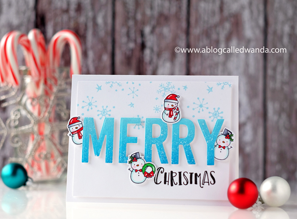 Those big alphabet dies are from Honey Bee Stamps. The snowmen stamps and dies are from Mama Elephant. And the pretty snow background and the 'christmas' word are from Right At Home Stamps. The letters were colored with Distress Inks and the snowmen were colored with Copic Markers.