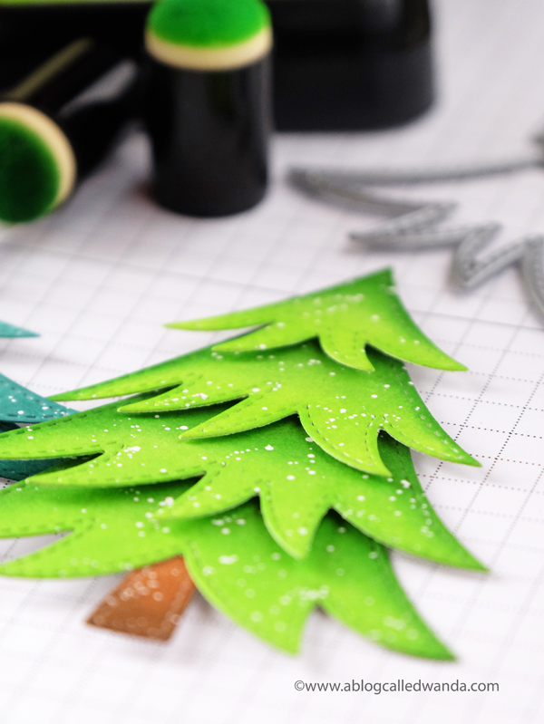 To make the trees, I used shades of green Distress Inks on the pieces. I used the small sponge daubers to do the blending. Each piece is not very big by itself so the small daubers are perfect. After the ink was dry, I splattered white ink over them to look like snow! I also used a clear Wink of Stella pen to splash shimmer onto the tree pieces. I attached the pieces together using foam tape. The star, trunk and some ornaments are all included in the die set.