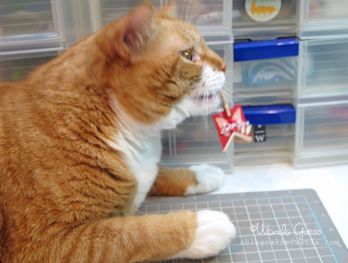 Here are my supplies…The stamp set is from Amuse Studio and I cannot remember (sorry) where I got this pretty washi tape. I put a touch of Stickles on the little steam clouds. Two Copics is all. R81 was a perfect match for this Bazzill paper.