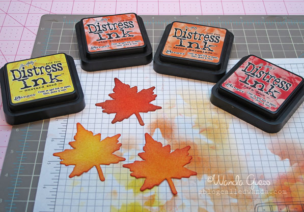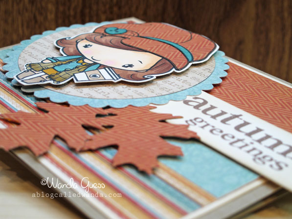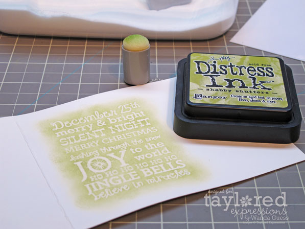 First I stamped my image in Versamark ink and clear embossed it. Then I colored my image with Distress inks and a sponge in the pretty colors. Next, I went back around and distressed the edges with a touch of brown ink. This adds just a touch of depth. Then I had fun layering on pretty cream snowflakes!