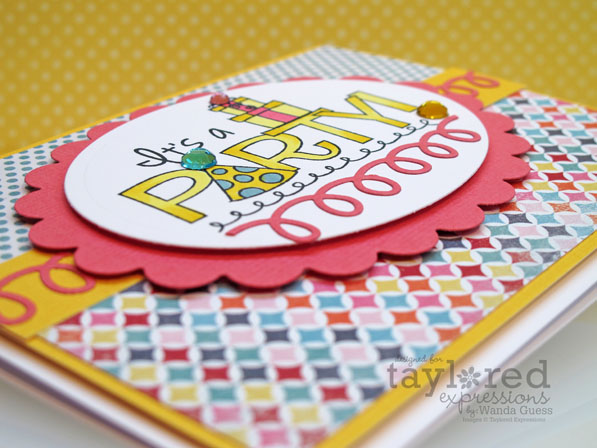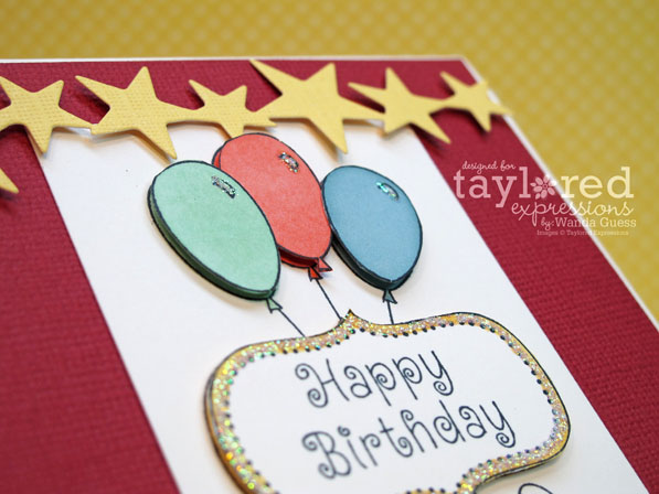 I used the Balloons image from the stamp set and combined it with some beautiful Cakewalk Designer Paper from October Afternoon. I also used the TE Reach for the Stars Border Die to jazz it up some!