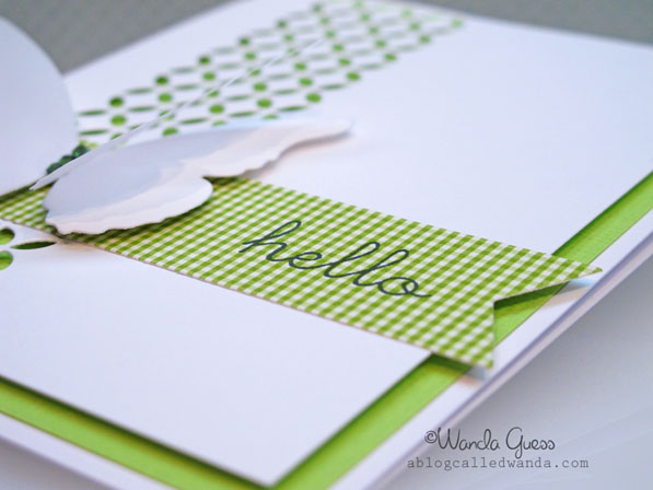 One trick for making your own embellishments, and something I do alot, is to cut out accent pieces from your patterned paper. Here I made a flower embellishment by cutting out the red flower, adding a button and then finishing it with some twine. On the other part of the card, I cut out another couple of pieces of the paper too. This way everything is sure to match!