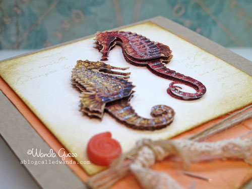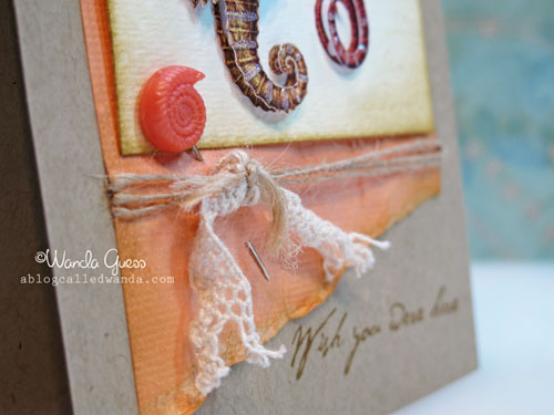 The next card uses the same collection and the same techniques, but has a totally different feel to it. I can't decide which card I like better! I started with the two seahorse stickers. The cream base they are on is actually watercolor paper so it's nice and thick. I distressed the edges with two colors of distress inks and then lighty stamped a background stamp or words on it.