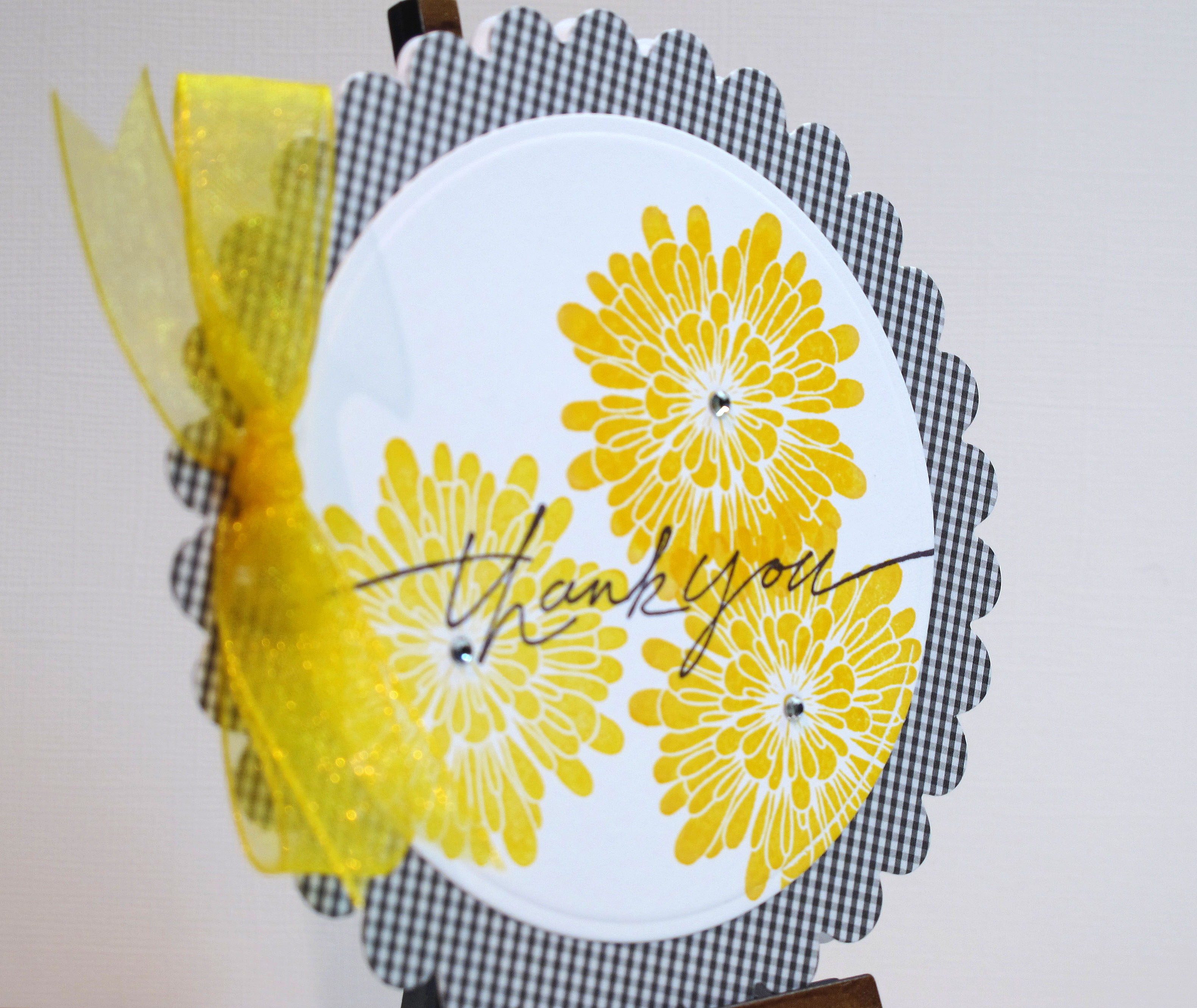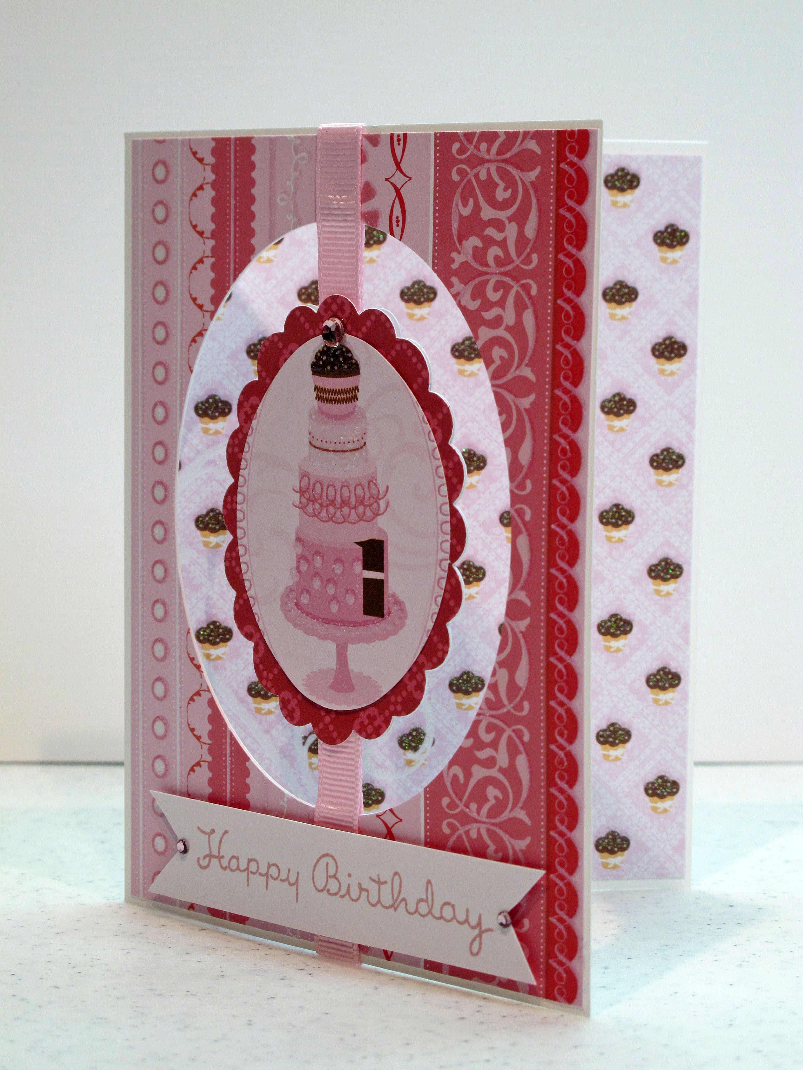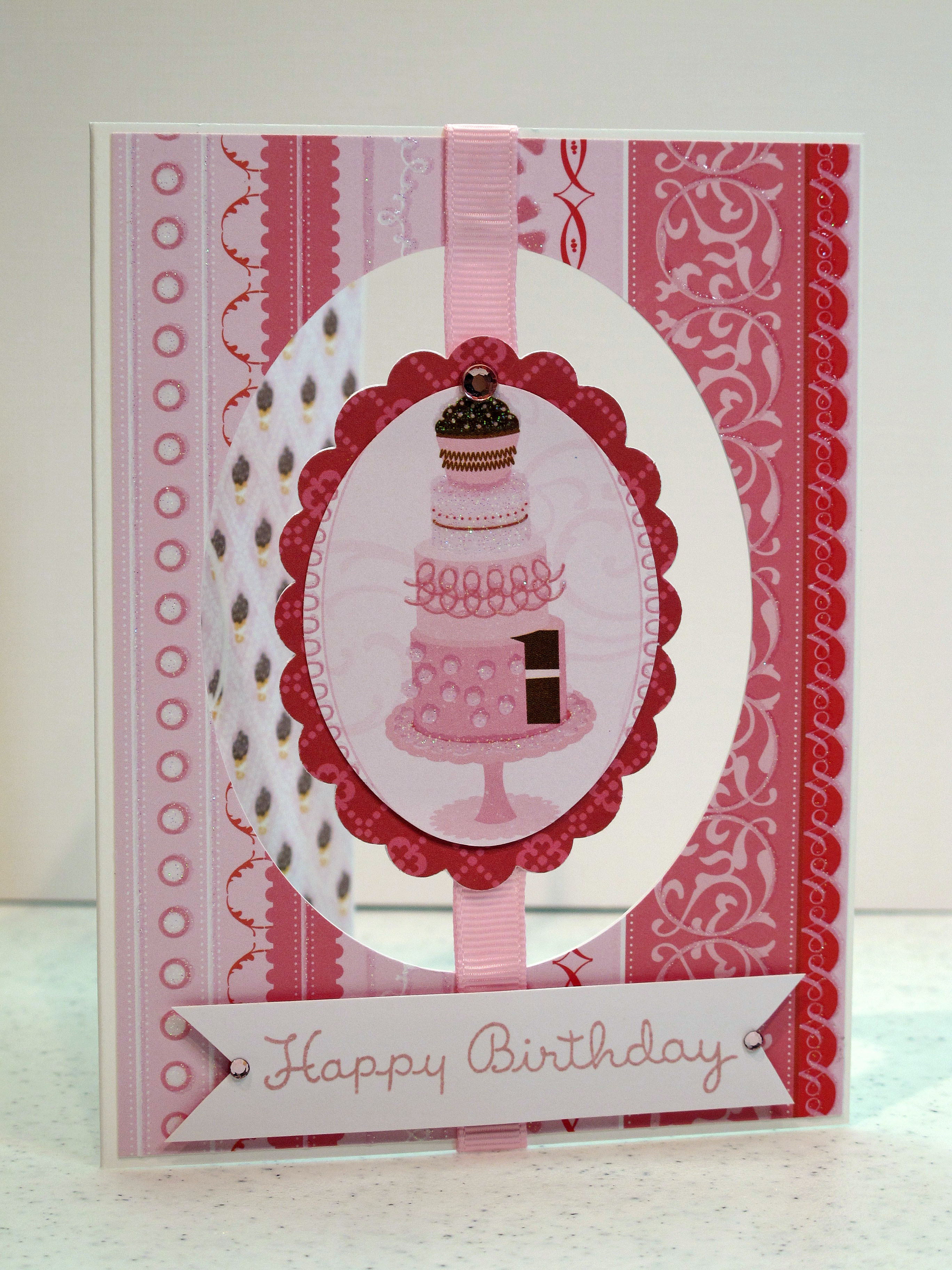 Here is the card. I tried a new technique with the cut out. I used my Creative Memories oval cutter after putting the layers of patterned paper together. Then I used my oval punches to make a center piece and hooked it all up with ribbon!