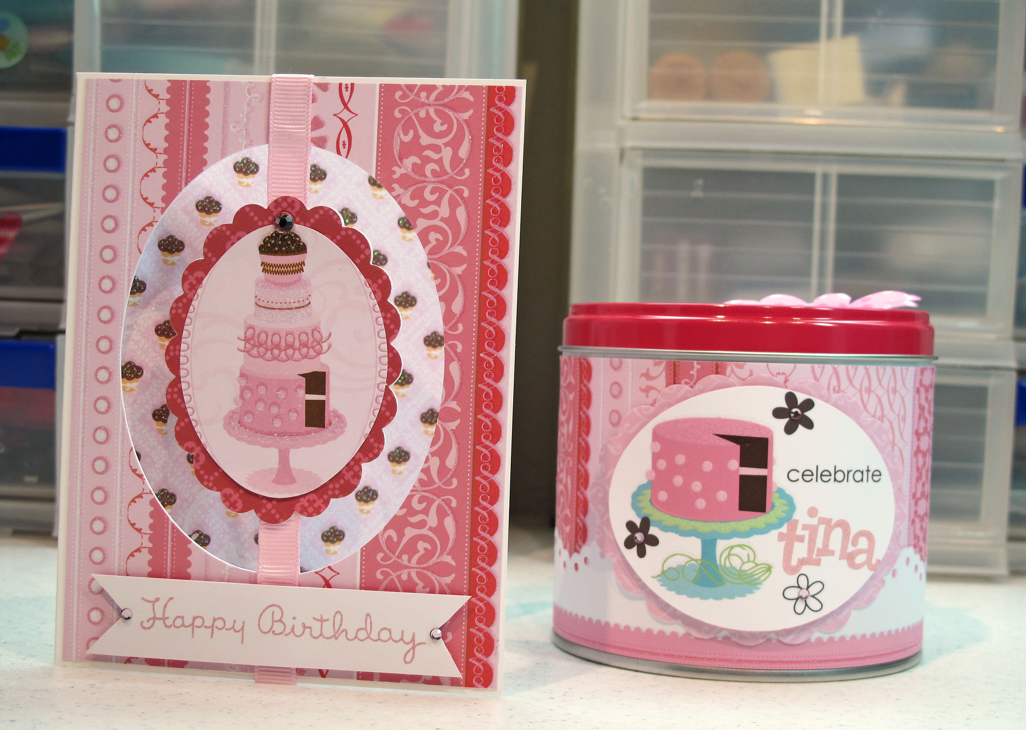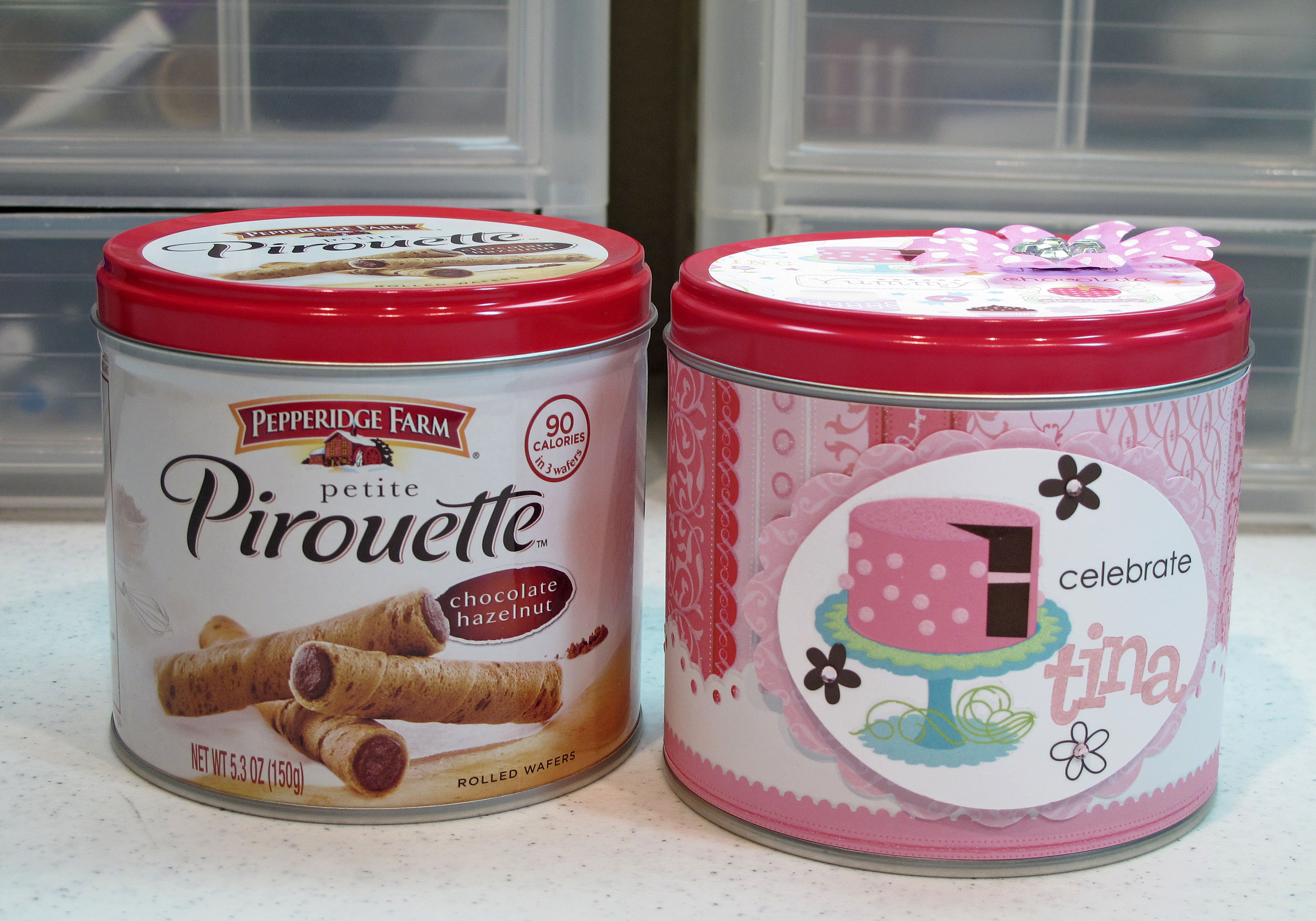 I decorated the tin with patterned paper and then some rub-ons and some stamped letters. Oh…and don't forget the bling! Pink and brown is the way to go. Before and after… One of my favorite projects for prezzies is to take these short Pepperidge Farm tins and decorate them specifically for the person. (Oh and it doesn't hurt that I have to eat the treats first!). They can hold a gift card, a little jewelry prezzy, some candy, or STAMPS!