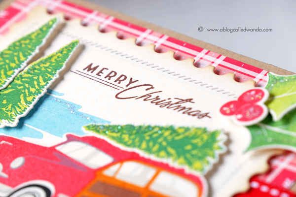 The car, the trees, and the holly leaves are attached to the card using foam squares or foam tape. The card base is made from Kraft cardstock (A2) and then layered with some beautiful PTI papers and ribbon from my stash.