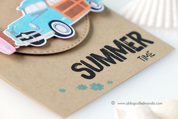 This final card today is clean and simple. I started with an A2 Kraft Card base and then die cut a Kraft circle for the focal point of the card. I stamped and die cut out the palm tree, wagon, and surfboard and then assembled the elements onto the circle. The little flowers stamped around the circle are the accent stamps for the surfboard!