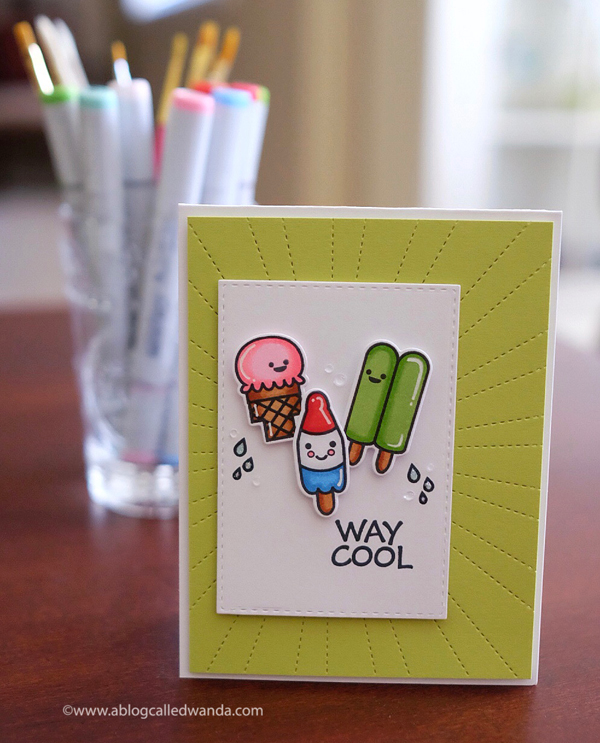 I made this card with the Avery Elle Cool Treats stamps and dies, my new favorite background die from Reverse Confetti, and my Copics! It's an A2 card – quick and simple layout. Lots of color, and some bits of shine too! I used my white gel pen to add some accents on top of my Copic coloring and everything is attached to the card using foam tape. I am starting to really get in the swing of Summer crafting! I have lots of cards made – I just have to take all the pictures now.