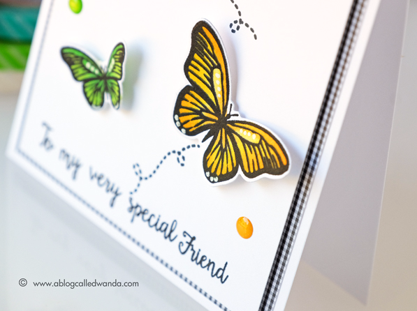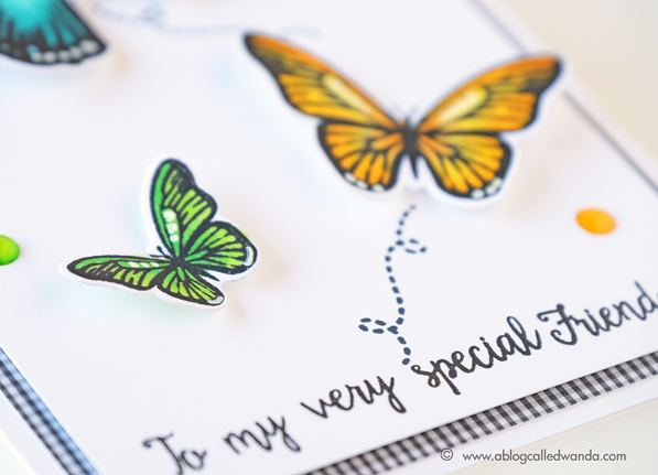 I stamped and colored three of the butterflies with my Copic Markers, then die cut them out with the matching dies. Then I added pretty white accents with a white gel pen. I left a lot of white space on my card to give all the color some 'room' to breathe!