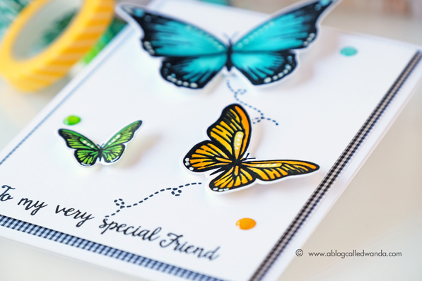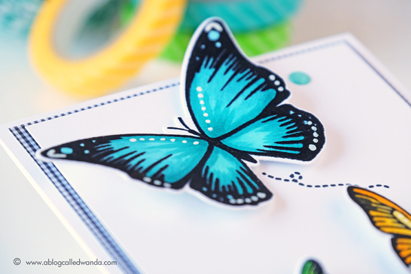 The large butterfly was colored in shades of aqua…so pretty! This is my favorite color, so I had to make the large one this color! The three butterflies are attached to the card using foam squares for dimension. The little trails are a stamp from a different Avery Elle stamp set and I thought it worked just right! (see stamp sets below)
