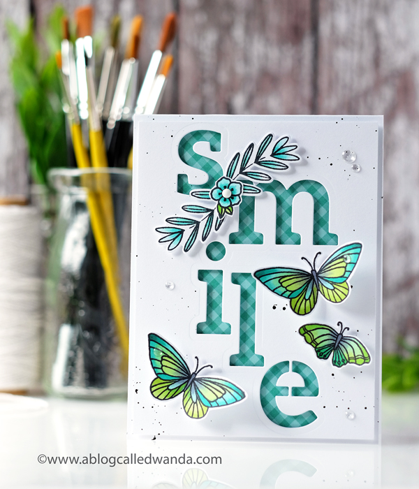 Today I'm sharing a card made with lovely LOVELY stamps and dies from Pinkfresh Studio! OH GOSH, how I love Pinkfresh Studio! They have the prettiest, most feminine florals and innovative dies. One of my favorite companies for sure! If they're new to you CLICK HERE to see their entire collection! My specific links for the products used today is at the bottom of my post. I have had this awesome 'smile' die cut for a while and finally used it! The word is all hooked together in one die – it's not separate letters. Super easy to die cut onto an A2 card front! Then I added my favorite gingham, and some soft florals and butterflies. I am inspired by the coming of spring so I used a light and fresh color palette of green and aqua.