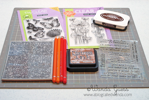 I'm sharing a new technique I've been wanting to try (stamping on text) and an old technique I haven't played with in a while (watercolor pencils). I made a friendship card that would be good for any occasion and used some of my favorite Hero Arts stamps. Hope you like it!