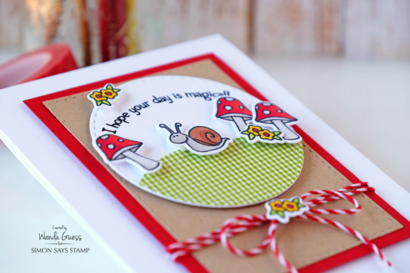 My first card for today was made with the new SSS Exclusive Secret Garden stamp set! It has a gnome and a fairy, and an adorable mushroom house! I personally just loved this cute snail… Maybe because I love to send snail mail! I stamped and die cut all my pieces and colored them with Copic Markers. I used a garden-y color palette of brown, red, yellow and green. A pretty piece of red and white twine finished off the front of the card.