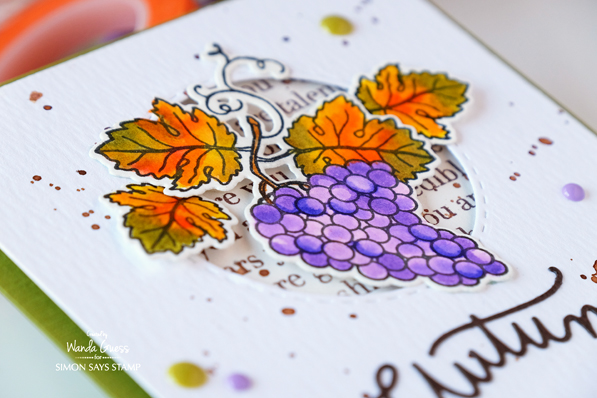 Lastly for today's post…. A truly Fall card! We live near Napa and one of the most beautiful sights in the world is the gorgeous grape leaves in Autumn. My husband and I love to photograph them and enjoy the season and the harvest. That is what inspired this card! I tried to color the grape leaves exactly how they would really look. I used my Zig Watercolor Brush Markers and had fun with it. After I colored my focal image I went back with a paint brush and added paint splatters in brown.