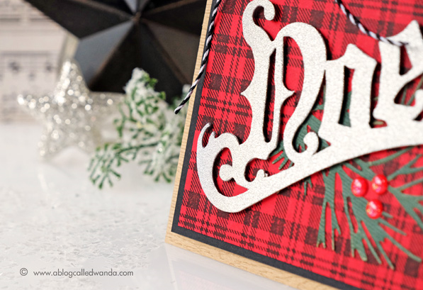 To make my red and black plaid background I simply too bright red card stock and stamped the plaid background stamp in crisp deep black ink! BAM! That's all there was to it! I LOOOOVE this so much! Next I took some silver glitter paper and adhered it to some chipboard to make it thicker. I ran that through my Big Shot and cut out the pretty Noel word with the Vintage Noel Die. Next I took some green Core-dinations Kraft Core cardstock and cut out the pine leaves with the Holiday Greens Die. I gently sanded the edges to let the kraft paper show through. Lastly, I added a few enamel dots and some black and white twine to finish it!