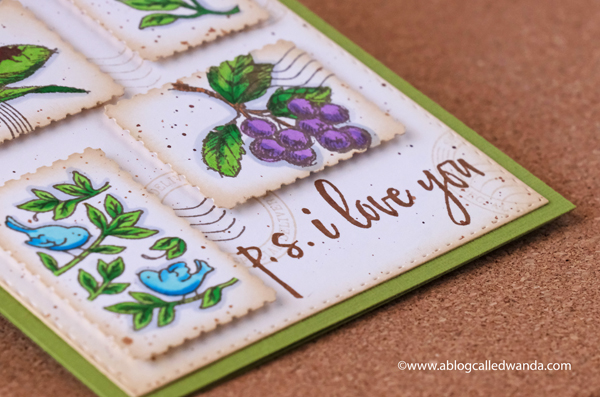 I stamped the Berry Patch berries, stems and leaves in pinks and greens… I stamped extra leaves so I could layer three different green colors. I used Copic Markers to add some little extra touches in a darker color (on the left side of the berries and on the leaves).
