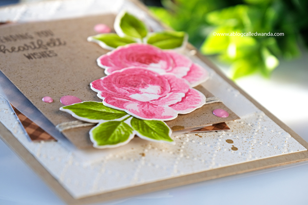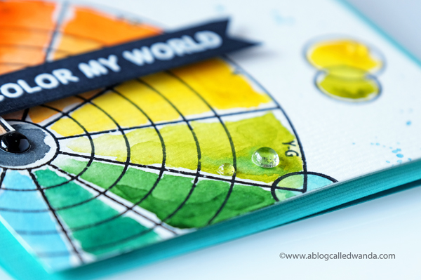 My card is an A2 card base out of paper from my stash (in my fav color). I cut out a watercolor paper layer and stamped two color wheels in the opposite corners. I made sure to put different colors for each one. Then I stamped a few of the circles around them to balance out the white space.
