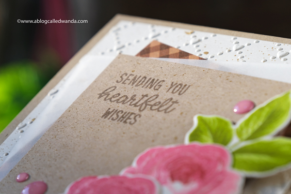 I used clear glue to attach the gold die cut on top of the colored background. Then I trimmed off the edges. Next I stamped the Waffle Flower Hugs and Prayers sentiment onto vellum using Stazon ink. I layered the vellum around the bottom of the card before attaching the card front to the base with foam tape. I added a few purple gems from my stash.
