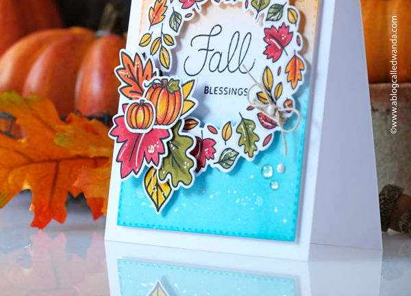 I set my inked panel aside to dry, and started working on all the other fun things. I stamped everything with black ink, and used Copic Markers for coloring. I added white gel pen accents as I love to do! I used the Falling Leaves Stamp Set and the Fall Corners Stamp Set to make my grouping of leaves and pumpkins on the left side of the wreath.