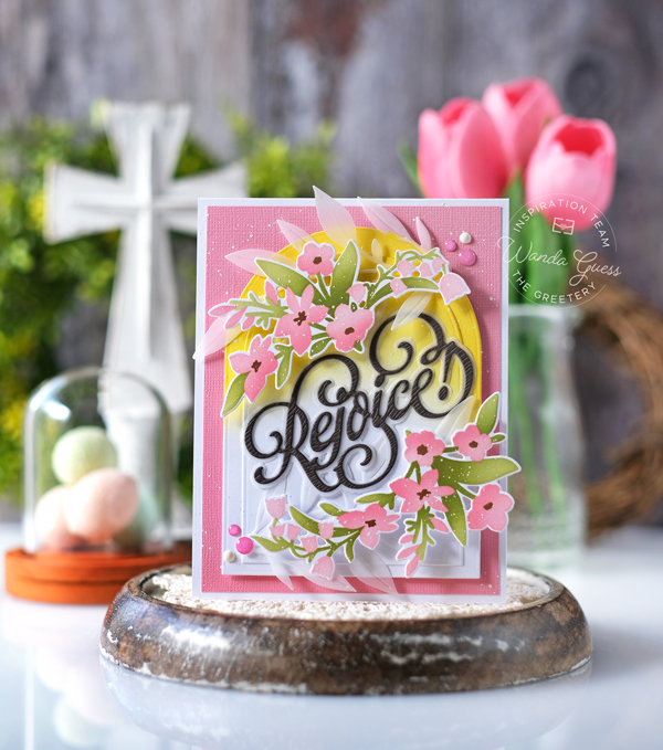 My first card for today features the brand new Spring Sprays stencils and Dies, and the brand new Rejoice Dies… I used the previously released Arches Dies and the Ruscus Dies too. I intend this one as an Easter card so I used pink and yellow and green for my color palette – a nice coral pink!! My finished card is an A2 white card base, layered in pink, then two arches, then my design elements.