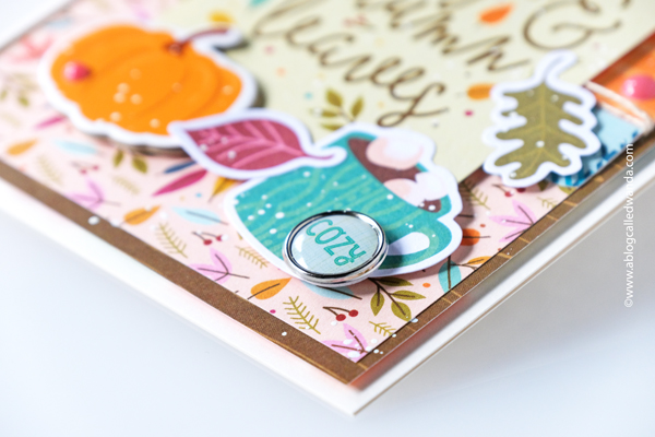 My second card is also an A2 cream card base. I again layered different patterned papers for my top layer. I used the big FALL word ephemera piece as my focal point, then added some cozy things…including that adorable sweater! How pretty are all these colors?? Seriously.