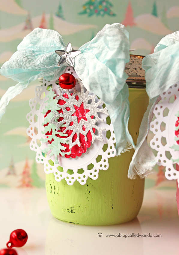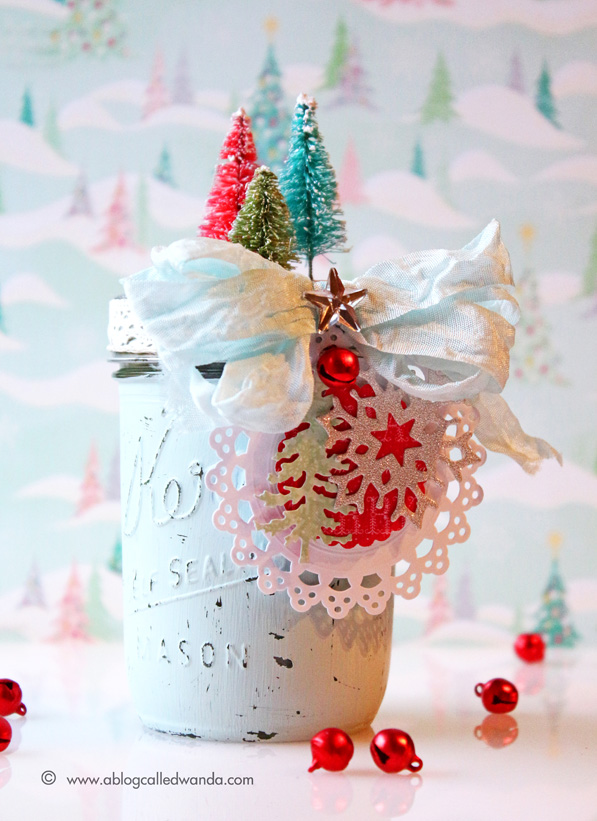 I made five different mason jars. This first one was made with the Petite Places Church and the little trees that go with the scenes. OMG right???