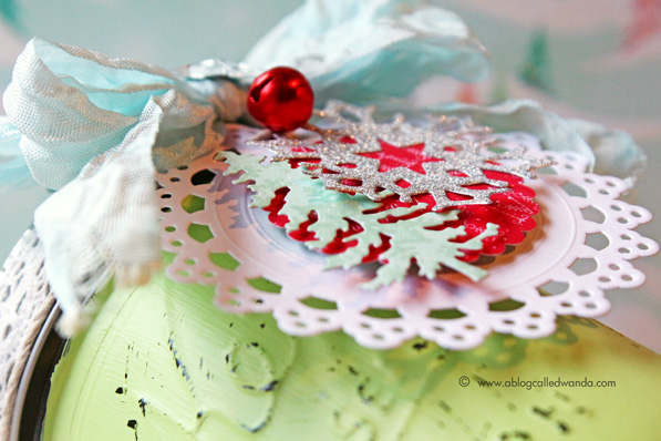 I decorated with the trimmings from the newest PTI kit…added some flowers and leaves. The crochet ribbon was glued on with E6000 glue and then the bow was placed on with glue dots.