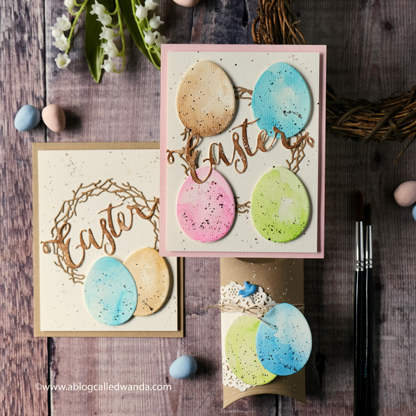 No stamping on either of these cards today. Only die cuts and watercolors! I used a wet on wet watercolor technique to color the apples. Some red and one green one. I added in some deep golden yellow accents to the painting. The leaves were painted with three or four shades of greens. Apple leaves have that gorgeous deep green color. I colored the stems brown and then generously splattered gold paint over all of them.
