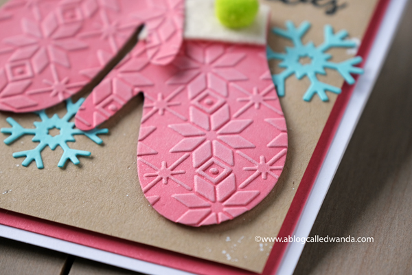 Here's a close up of the mittens. Once I embossed them I kind of thought the pink was too bright. I wanted to tone the color down a little bit. So, I used white pigment ink and a big sponge dauber and gently went over the pattern with white ink. OOHHH frosty! That was just the right touch. I also spritzed the mittens with Frost Shimmer Spritz. You can't really tell in the photos but they are slightly shimmery too – like snow! EEP.
