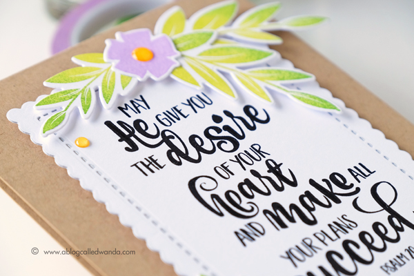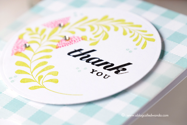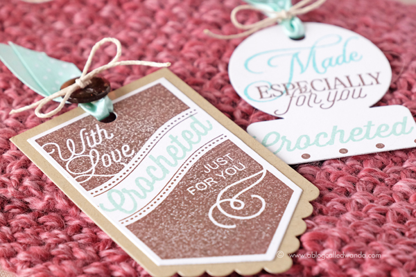 I used several shades of green and brown to create a natural feel to the card. When I put the parsley onto the tag, it kind of got lost. So I stamped some background images in a soft brown tone to ground it. I stamped the words in darker brown.