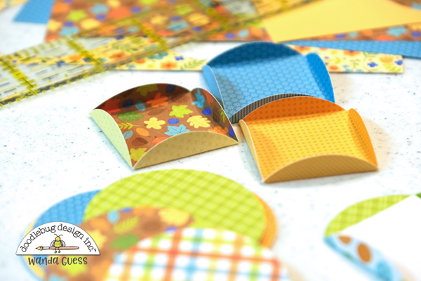 I started my project by gluing a sheet of yellow buffalo check paper to a piece of chipboard. Then I used the Great Outdoors 6×6 paper pad to punch out a bunch of 2" circles with a circle punch. I adore all the fall colors and patterns in this paper pad. The circles were hand folded into the shapes for the finished project. I used a cardstock square to fold the circles up. More on this below….