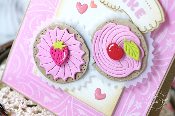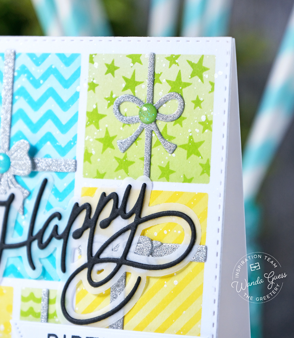 I die cut the pears from yellow cardstock and then coated them in glitter to look like sugared fruits. The sentiment is from the Winterland Layers stamp set and I embossed it in white onto black cardstock.