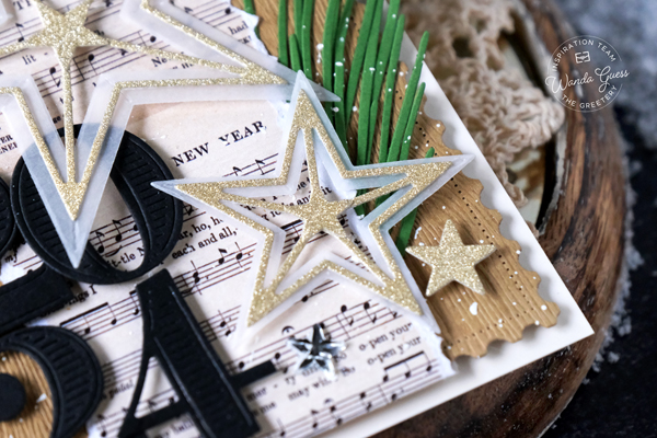 My next project today is a card I made to feature the brand new Large and Small Rustic Stars Dies! My finished card is an A2 cream card base layered with woodgrain and music paper. When I think of stars, I almost always think of New Year cards! So, that's what I made here!! Gold and vellum stars, with bold black numbers and pretty pine wisps….. Where's the champagne!!??