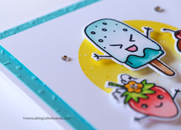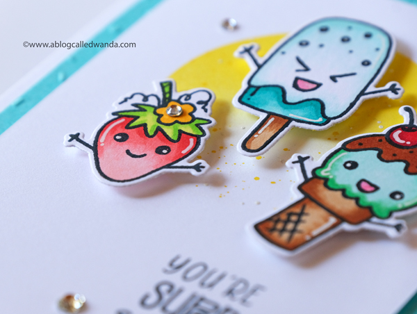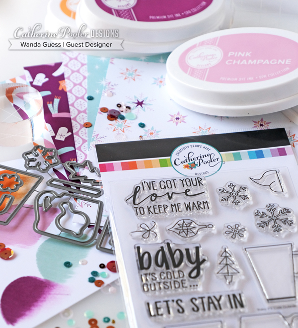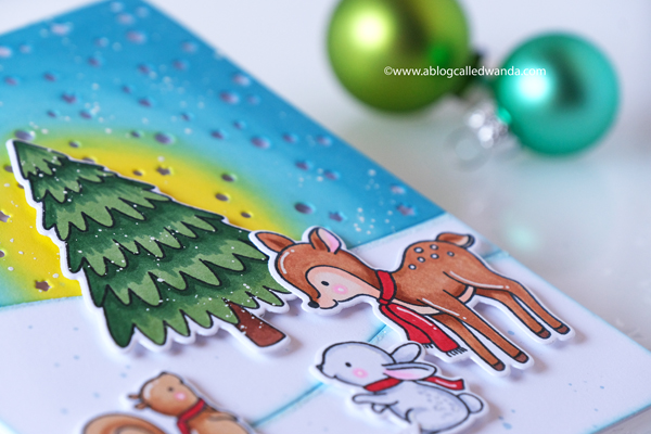 I used the Snowy Sky Dies and the Glacier Peaks Dies to create the background scene for my Yeti! The top portion of the scene is blue paper that I edged with blue distress ink for a bit of blending. The mountains are grey paper and the peaks are white paper covered in Stickles. I stamped the Yeti and colored him with Copic Markers. His scarf was paper pieced with this paper collection! Isn't he sweet??