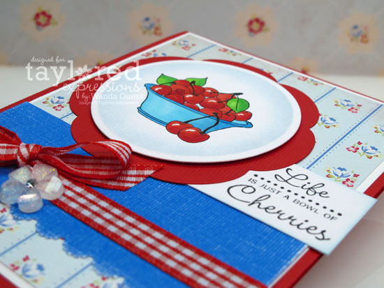 The stamp set I used is from Taylored Expressions and is called Berries and Cherries! SO many cute images in this one. I used the mega-cute paper collection from Girls Paperie called Kitch. I'm pretty sure I bought 10 sheets of every design of this one…so you'll be seeing it a lot on the bloggy blog!