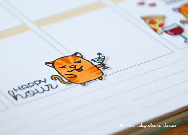 I used the adorable little cats several times on my pages. I colored them all to look like my sweet Buddy – of course! Some of them peek out from the lines of the planner page and some are stand alone like the little tipsy kitty on happy hour day! I used some washi tapes together to add some more color. I don't tend to stamp or decorate too much, because I write big, and I want to make sure to leave space for my appointments etc.