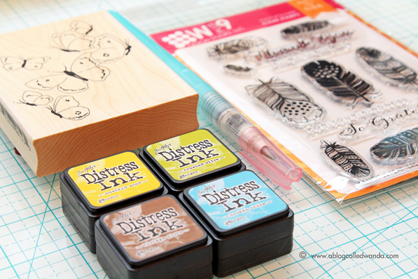 This butterfly stamp is an oldie! It's from Impression Obsession, and it's been in my stash for years….and now I gave it new life with a new technique! I stamped the image first in Antique Linen Distress Ink onto the flat side of a piece of watercolor paper. That gave me a really nice soft image. Then I watercolored my butterflies with shades of blue, olive and yellow… The sentiment is from a pretty set from WPlus9. That font is gorgeous. You can see I also colored the background with a blue wash and then spattered some brown too. The brown makes it have a 'natural' feel to it and ties in the wood paper…