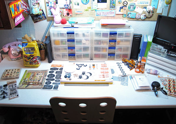 Here is my desk in full on production line mode! You can see how I just layed everything out in front of me so I could pick and choose my elements. I only had a package of 12 glassine bags, otherwise I could have made lots more! The owl and moon dies are from Tim Holtz.