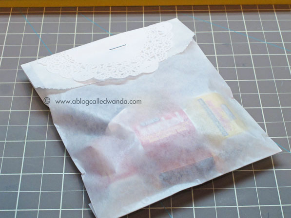 I found it easiest to put the candy in, then fold the bag over first. Then I stapled on a doily to cover up the top and make a nice base for everything else. The staple holds the bag shut, and it gets covered up by the 'toppings.'